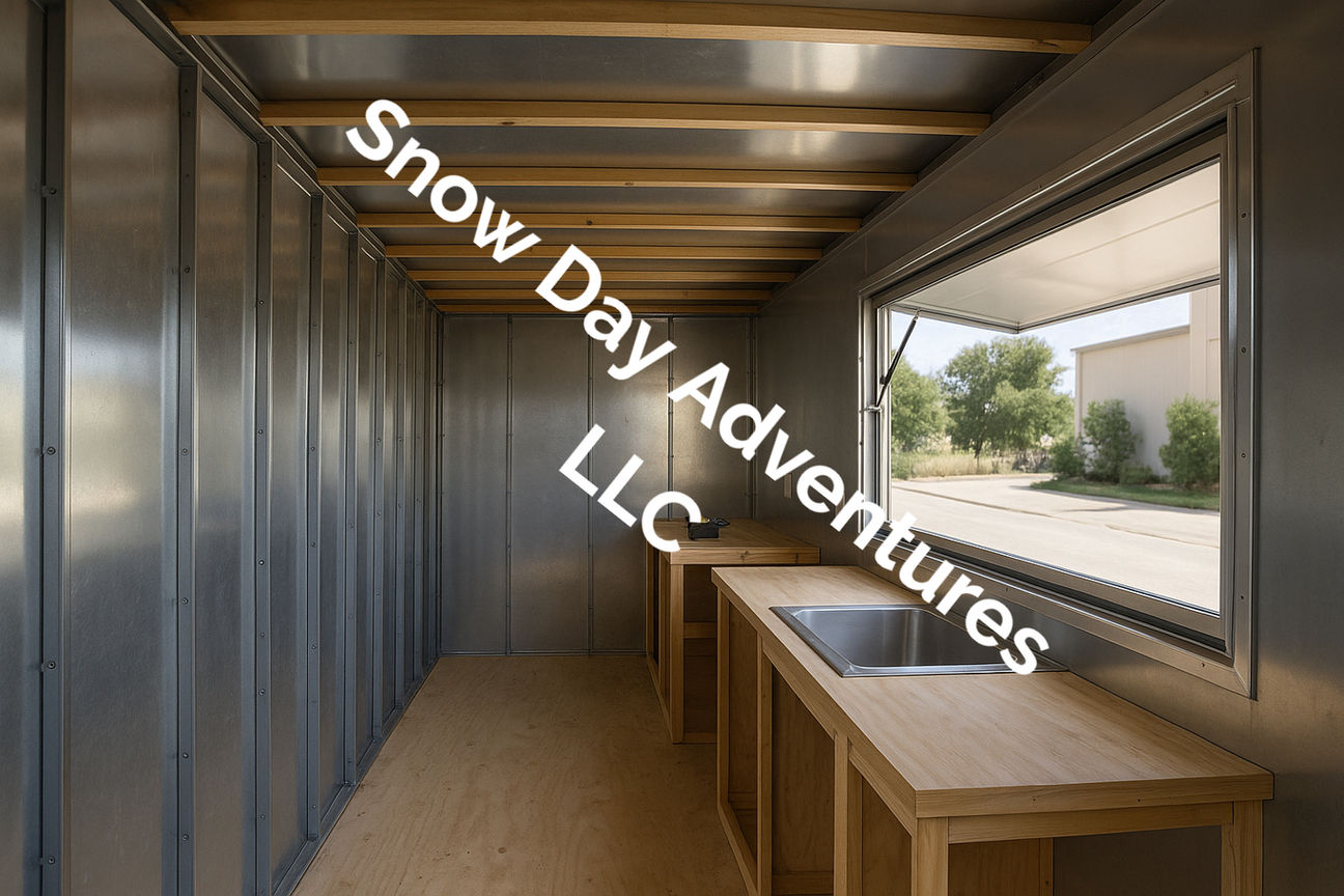 This is our most popular option. Ideal for those who want a plug-and-play solution. You’ll get a finished interior with flooring and wall panels, completed electrical and plumbing, counters, a sink, and a layout that meets Texas health codes. It’s ready for graphics and comes with a one-year workmanship warranty.